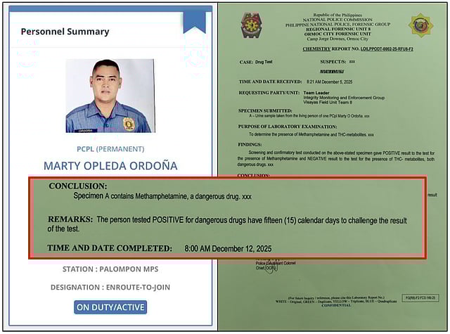 The Philippine National Police (PNP) Integrity Monitoring and Enforcement Group–Visayas Field Unit (IMEG-VFU) conducted the targeted drug test after receiving intelligence information in September 2025 alleging that Police Corporal Marty Opleda Ordoña of the Palompon MPS, under the Leyte Norte Police Provincial Office (PPO) and Police Regional Office 8 (PRO 8), was involved in the use and proliferation of illegal drugs.