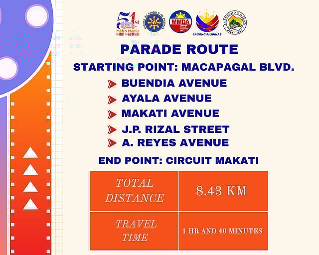 The Metro Manila Development Authority (MMDA) will implement a temporary lane closure and stop-and-go scheme along the route of the Metro Manila Film Festival (MMFF) 51st Edition Grand Parade of Stars on 19 December, Friday, in Makati City.