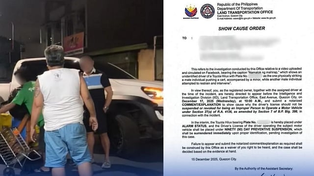 LTO chief Assistant Secretary Markus V. Lacanilao announced Monday that Subong was issued a 90-day preventive suspension and a Show Cause Order (SCO), requiring him to explain why his license should not be permanently revoked under charges of being an Improper Person to Operate a Motor Vehicle.