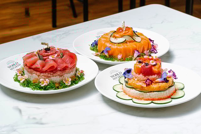 Kuro Maguro sets the tone for indulgence with its elegant seafood cakes. The Salmon Cake stacks seasoned rice with fresh salmon in a smooth, circular layer, while the Megumi Cake adds richness with salmon, maguro, tobiko, oboro and black caviar. For tuna lovers, the Maguro Sushi Cake highlights maguro layered with rice and finished with sweet fish flakes and roe for a savory pop.