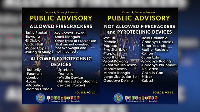 Meanwhile, strictly prohibited are hazardous firecrackers and devices such as Watusi, Piccolo, Poppop, Five Star (Big), Pla-Pla, Lolo Thunder, Giant Bawang, Giant Whistle Bomb, Atomic Bomb, Atomic Triangle, Large-Size Judas Belt, Goodbye Delima, Hello Columbia, Goodbye Napoles, Super Yolanda, Mother Rockets, Kwiton, Super Lolo, Goodbye Bading, Goodbye Philippines, Bin Laden, Coke-in-Can, Pillbox, and Kabasi.