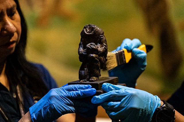 Jude Roland Ay-Ay, senior shrine curator of the Rizal Museum, and museum technician Emily Bonaobra clean an undated sculpture by national hero Jose Rizal depicting the Portuguese Catholic priest San Antonio de Padua at the Rizal Shrine in Intramuros, Manila. Rizal created the work during his exile in Dapitan from 1892 to 1896. The sculpture was heavily damaged during World War II, resulting in the loss of its head.