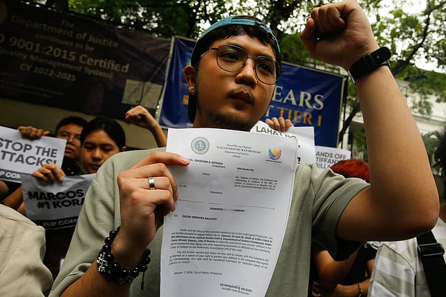 Campus journalist Jacob Baluyot gets support from fellow student leaders as he appears before the Department of Justice in Padre Faura, Manila, for a preliminary investigation on Thursday afternoon, 15 January 2026. Baluyot is one of the youth leaders that was tagged by state authorities for leading the violent standoff during the 21 September anti-corruption protest at the Mendiola Peace Arch.