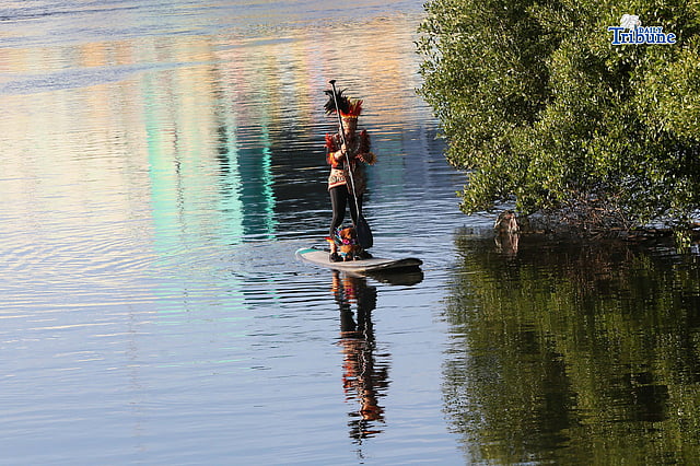 Lucy Lynette Ponce Uygongco, clad in a Dinagyang warrior costume, paddles along the Iloilo River with her dog on the eve of the Dinagyang Festival in Iloilo City, promoting healthy living and a clean river on January 24, 2026.