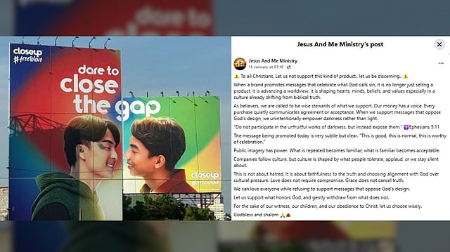 A recent Closeup billboard celebrating LGBT love drew sharp criticism from the "Jesus and Me Ministry," which called for its removal via a Facebook post. The ministry framed the ad as promoting sin and undermining biblical values, arguing that corporate marketing should prioritize moral guidance over societal trends.