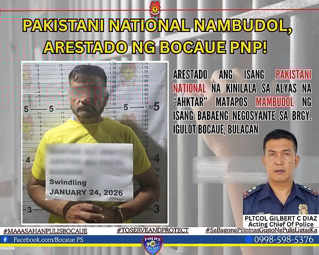 Isang Pakistani na naiulat na nambudol sa isang establisyimento ang agad namang hinuli ng Bocaue Municipal Police Station (MPS) sa Barangay Igulot, sa bayan ng Bocaue, Bulacan nitong Enero 24, 2026.
