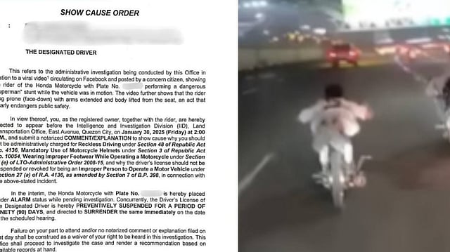 The Land Transportation Office (LTO) has issued show-cause orders to a motorcycle rider filmed performing a dangerous stunt on Commonwealth Avenue and a sport utility vehicle driver involved in a viral road rage incident.