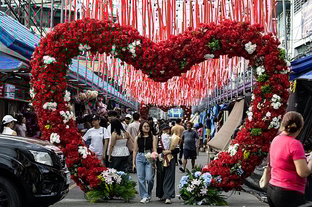 People walk past a heart-shaped arch made out of crimson roses at the Dangwa Flower Market in Manila on Sunday, 1 February 2026, as the love month begins.