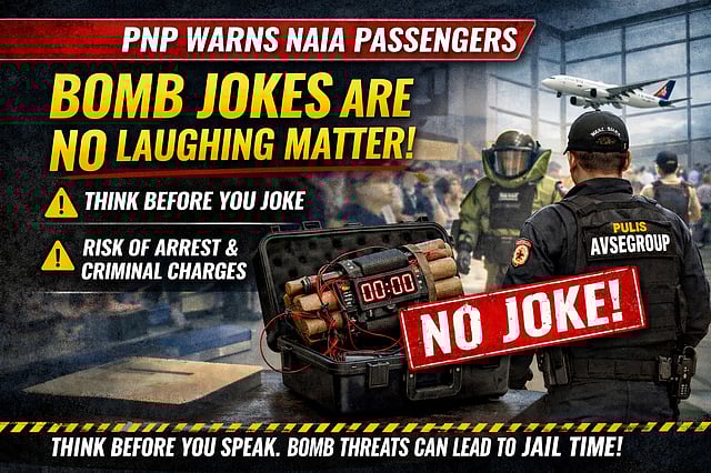 The Philippine National Police on Monday warned airport passengers against making bomb-related jokes following a series of incidents at the Ninoy Aquino International Airport, stressing that such remarks are treated as serious security threats and carry legal consequences.