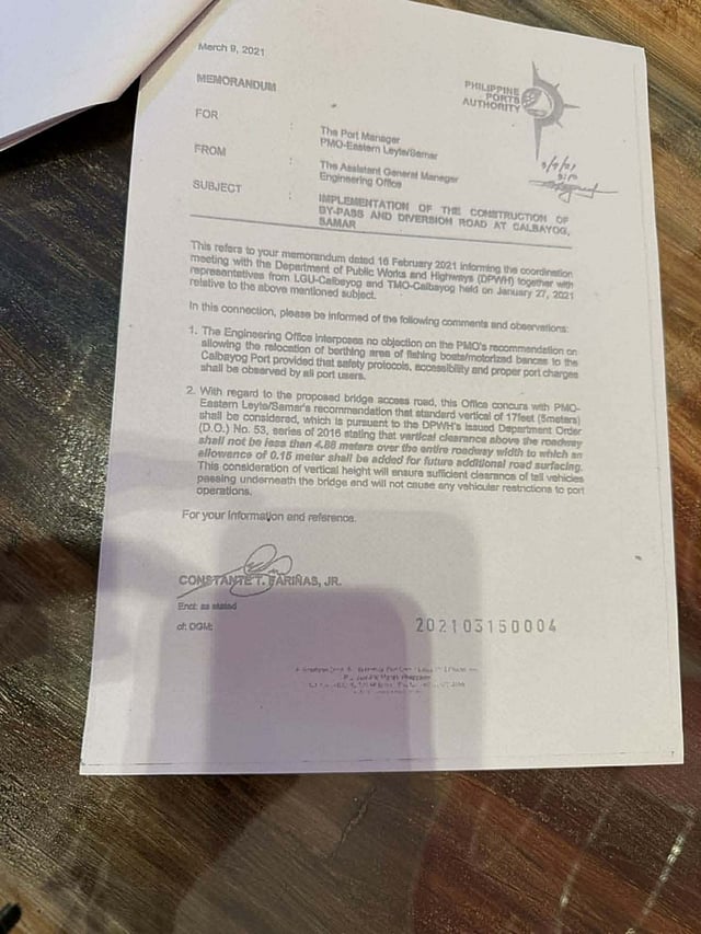 However, a memorandum dated March 9, 2021 from the PPA Engineering Office shows that the port authority had been informed of the project, including the proposed bridge access road in Calbayog City.