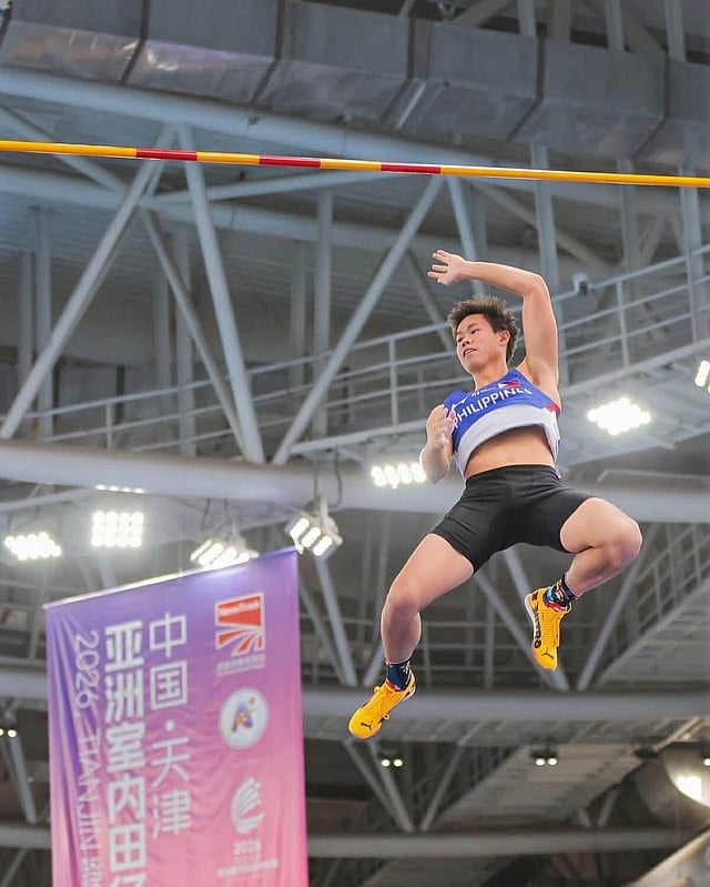 Ernest John Obiena cleared 5.70 meters to win the 12th Asian Indoor Athletics Championships on Saturday at the Tuanbo Sports Centre Athletic Arena in Tianjin, China on Saturday.