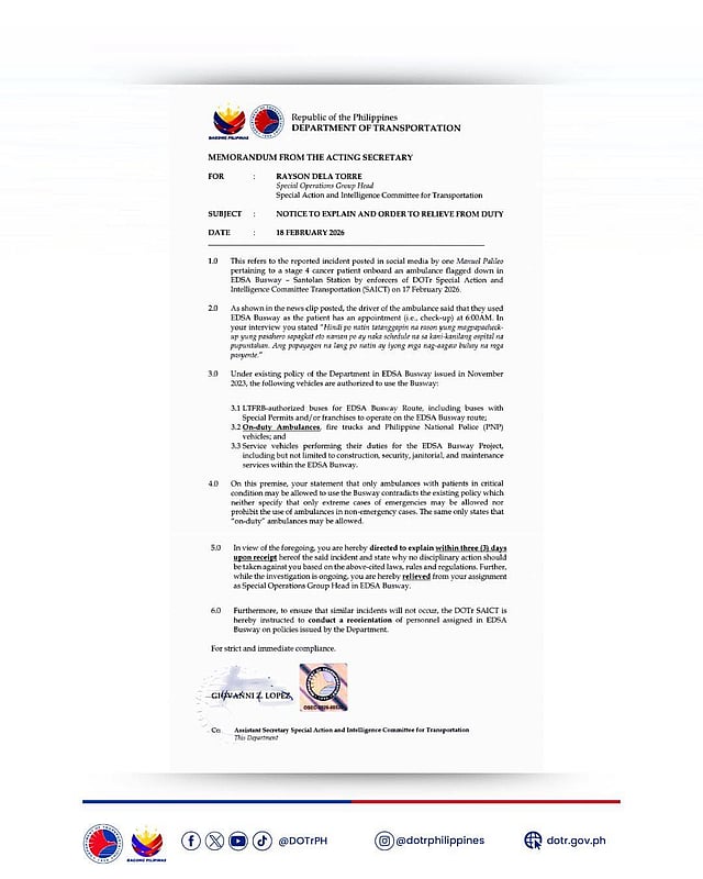 The Department of Transportation (DOTr) has relieved Rayson Dela Torre, head of the Special Action and Intelligence Committee for Transportation (SAICT), from his post following controversy over the use of the EDSA busway by ambulances.