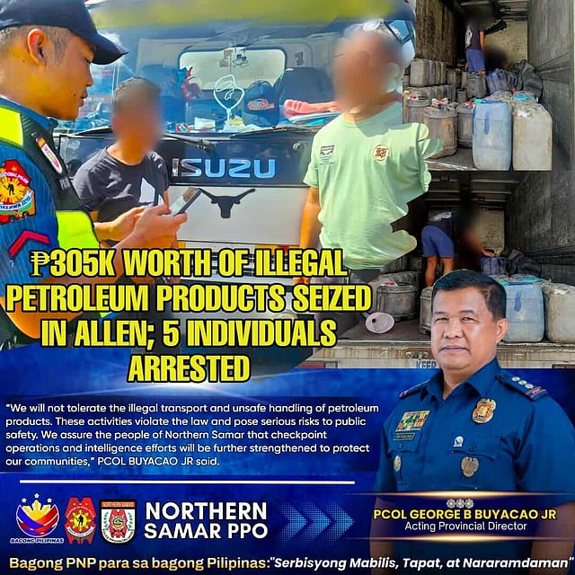 CATARMAN, Northern Samar – The Philippine National Police arrested five men who were illegally transporting petroleum products in two separate checkpoints along the Maharlika Highway in Allen, Northern Samar, early morning on 17 February 2026.
