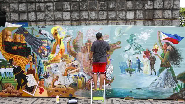 Artist Anthony Jandusay applies primer to the mural “Noon, Ngayon, at Bukas—Tayo ang People Power” at the EDSA Shrine, formally known as the National Shrine of Mary, Queen of Peace, Our Lady of EDSA, on Sunday, 22 February 2026, in Quezon City.