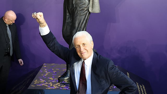Now, he's immortalized outside the Lakers' arena in downtown Los Angeles, a bronze likeness of Riley — wearing one of his favorite Armani suits and with one fist raised — ranged alongside statues of Lakers greats Elgin Baylor, Kobe Bryant, Shaquille O'Neal, Jerry West, Magic Johnson and Kareem Abdul-Jabbar, as well as beloved broadcaster Chick Hearn.