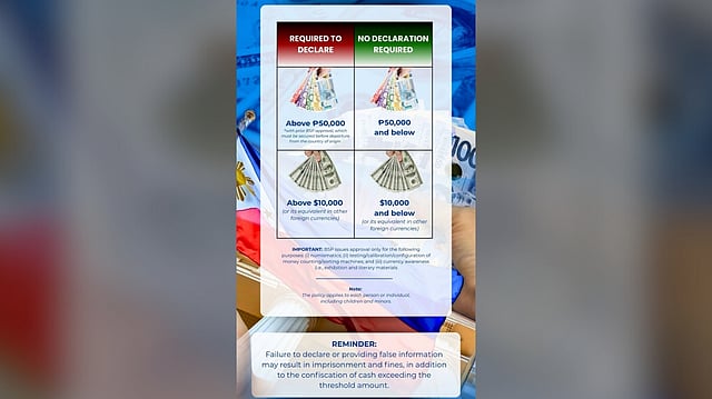 The Bureau of Customs (BoC) on Saturday reminded travelers of long-standing rules governing the entry and exit of Philippine and foreign currencies, warning that failure to declare excess amounts could lead to confiscation.