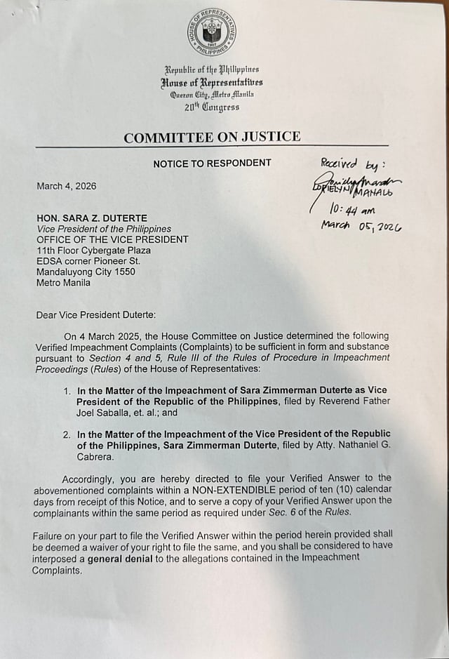 In a “Notice to Respondent” dated 4 March 2026 and addressed to the Office of the Vice President at Cybergate Plaza in Mandaluyong City, the committee ordered Duterte to submit her verified answer within a fixed period under the House rules on impeachment proceedings.