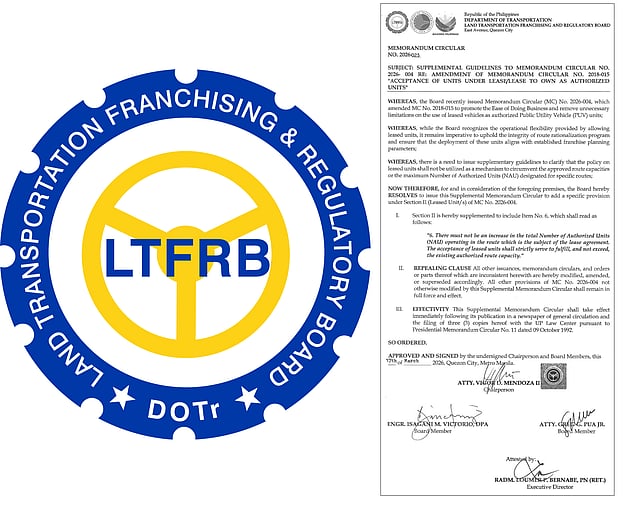 The Land Transportation Franchising and Regulatory Board (LTFRB) has ordered that leased public utility vehicles (PUVs) must not exceed the authorized number of units per route under Memorandum Circular No. 2026-023.