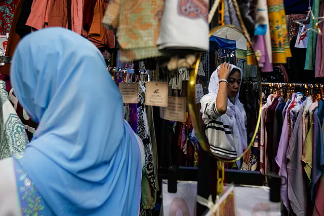 Muslims shop for abayas, hijabs, and gamis at the pop-up stores near the Golden Mosque in Quiapo, Manila, a day before Eid'l Fitr. The holiday marks the end of the month-long Ramadan fast, a time when the community dons their finest attire for communal prayer and family fellowship.