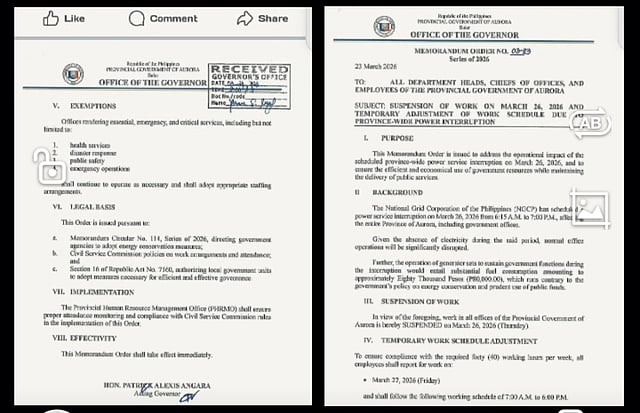 BALER, Aurora — The Provincial Government of Aurora will suspend all office operations on Thursday, 26 March, due to a scheduled province-wide power interruption by the National Grid Corporation of the Philippines.
