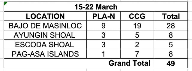 The latest tally marked an increase from the 30 Chinese vessels monitored in West Philippine Sea features from 1 March to 8 March, based on previous military monitoring.