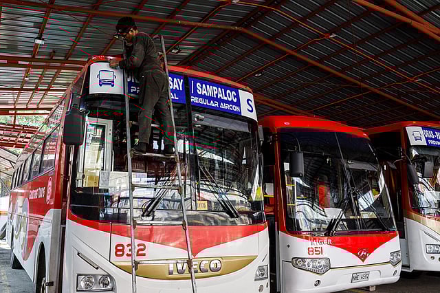 Workers conduct maintenance on buses at a terminal in Manila on Saturday, 28 March 2026, ahead of the expected Holy Week exodus.