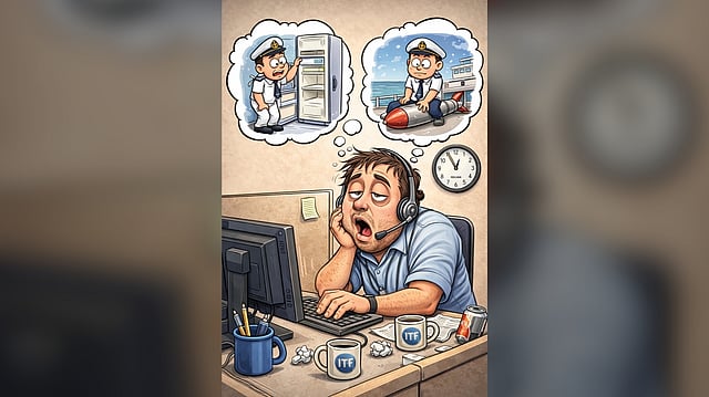Make a caricature of a sleepy telephone hotline operator receiving calls from his headset and computer station in the office labeled ITF Helpline. A clock on the wall reads 2 a.m. London time. A thought balloon shows a sailor opening an empty refrigerator. Another though balloon shows a sailor pointing to a missile piercing through the ship’s hull.