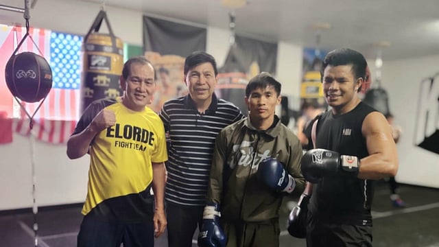 IBF champion Pedro Taduran (second from right) receives a surprise visitor at the Knuckleheads Boxing Gym in Las Vegas on Saturday in manager Marty Elorde (second from left), who swears the Filipino southpaw is ready to defend his crown this Friday in Temecula, California. Photograph courtesy of Marty Elorde