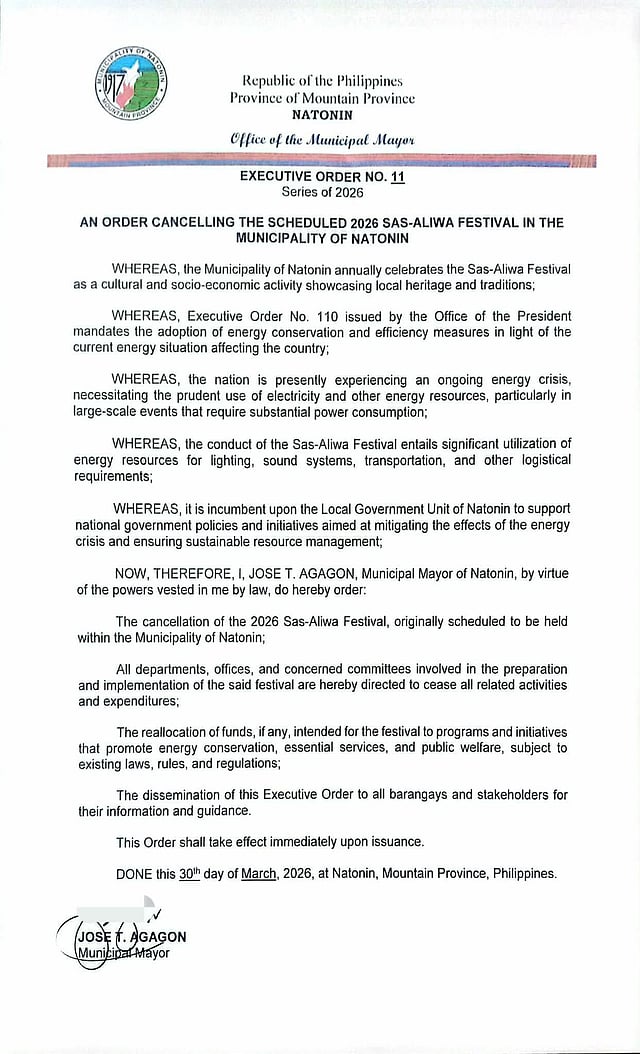 In Executive Order No. 11 (EO), Natonin Municipal Mayor Jose T. Agagon, on March 30, 2026, directed the cancellation of the festival. "Sas-aliwa" refers to a community gathering, homecoming, and the strengthening of unity among the community.