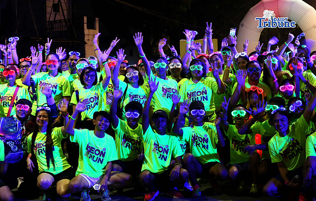(March 28 2026) Mall goers and Runners wearing neon colored shirt and lighted shades as they participate in the community run in observance of earth hour at SM Marikina on March 28, 2026. SM mall switch off their lights from 8:30-9:30 as part of the annual ceremonial event of earth hour. Earth Hour, organized by the World Wildlife Fund (WWF), is a global grassroots movement urging individuals, communities, and businesses to turn off non-essential electric lights for one hour. Photo/Analy Labor