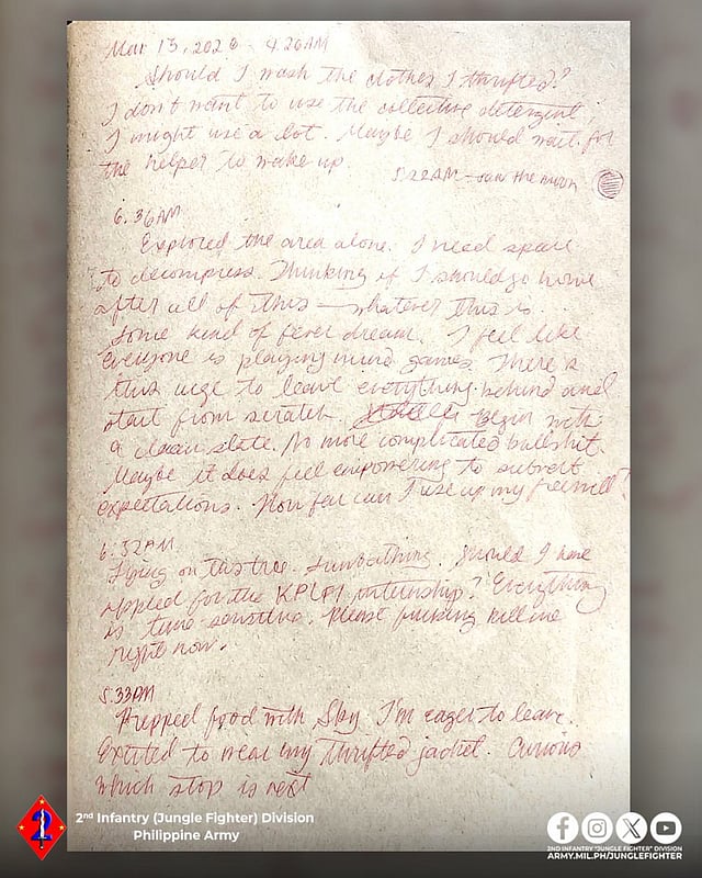 The Philippine Army’s 2nd Infantry (Jungle Fighter) Division on Tuesday said newly recovered handwritten notes from an encounter in Occidental Mindoro offer insight into how foreign recruits are integrated into the New People’s Army.