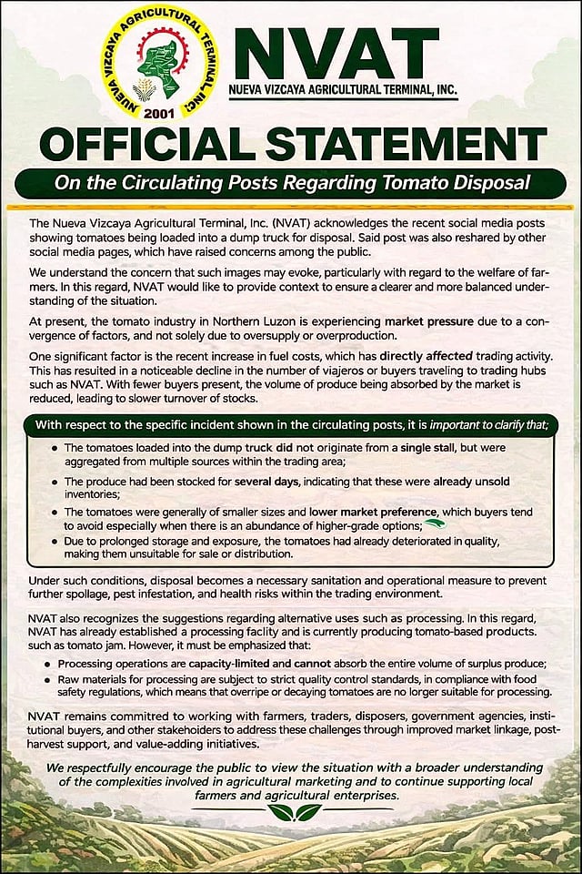 NUEVA VIZCAYA — The Nueva Vizcaya Agricultural Terminal Inc. (NVAT) has clarified the disposal of tomatoes seen in a viral video, citing market slowdown and declining product quality.