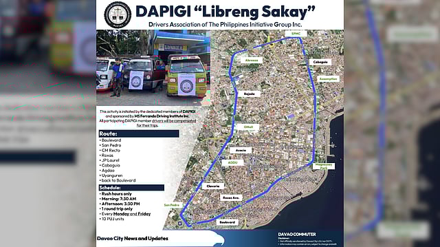 The program utilizes 10 vehicle units covering a loop that includes Boulevard, San Pedro, C.M. Recto, Roxas, J.P. Laurel, Cabaguio, Agdao and Uyanguren. According to the group, the free service is specifically designed for rush hour traffic. Scheduled trips depart at 7:30 a.m. and 3:30 p.m.