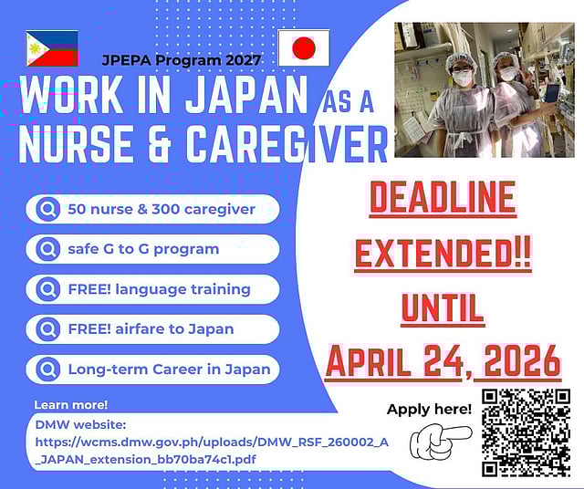 The Embassy of Japan announced that the applications for the Japan-Philippines Economic Partnership Agreement (JPEPA) nurse and care worker candidates are extended until 24 April.