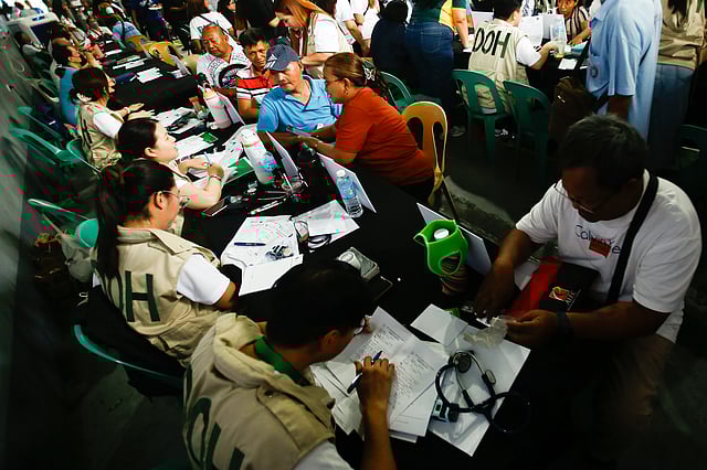 Public Utility Jeepney (PUJ) drivers, farmers, and barangay health workers (BHWs) queue for medical and dental services during the launch of Purokalusugan in Manila, 16 April 2026. A flagship initiative of the Department of Health, Purokalusugan aims to bridge the gap in healthcare by bringing essential services directly to the grassroots level.
