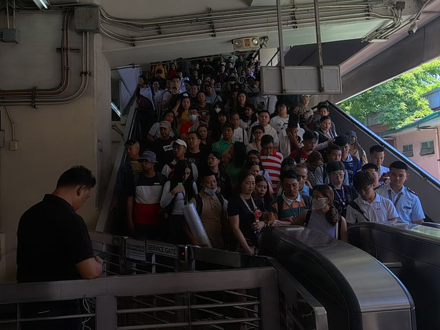 Commuters alight the LRT-1 Central Terminal Station in Manila on 16 April 2026, following a service disruption. Operations are currently split into two zones—Fernando Poe Jr. to Central Station and Baclaran to Dr. A. Santos Station—as technicians work to resolve signaling issues at Vito Cruz Station.