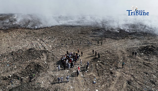 LANDFILL BLAZE FROM ABOVE: An aerial view of the Navotas Sanitary Landfill on 16 April 2026 shows a fire that has been burning for days, affecting nearby communities in Navotas, Malabon, and Obando, Bulacan. Photo by Analy Labor.