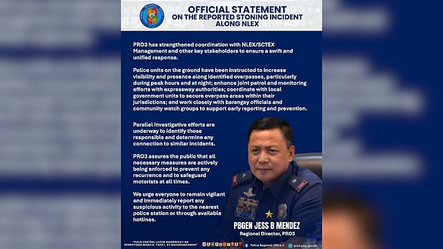 CAMP OLIVAS, Pampanga — The Police Regional Office 3 (PRO3) has launched a thorough investigation into the reported stoning incident along the North Luzon Expressway (NLEX) that endangered the lives of motorists recently.