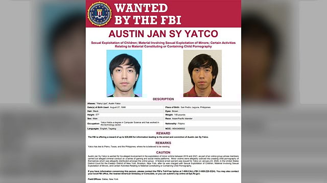 In a wanted notice issued Saturday (Philippine time), the FBI identified the suspect as Austin Jan Sy Yatco, 27, a native of San Pedro, Laguna, who previously lived in Plano, Texas, before allegedly fleeing the United States. He is believed to be in the Philippines.