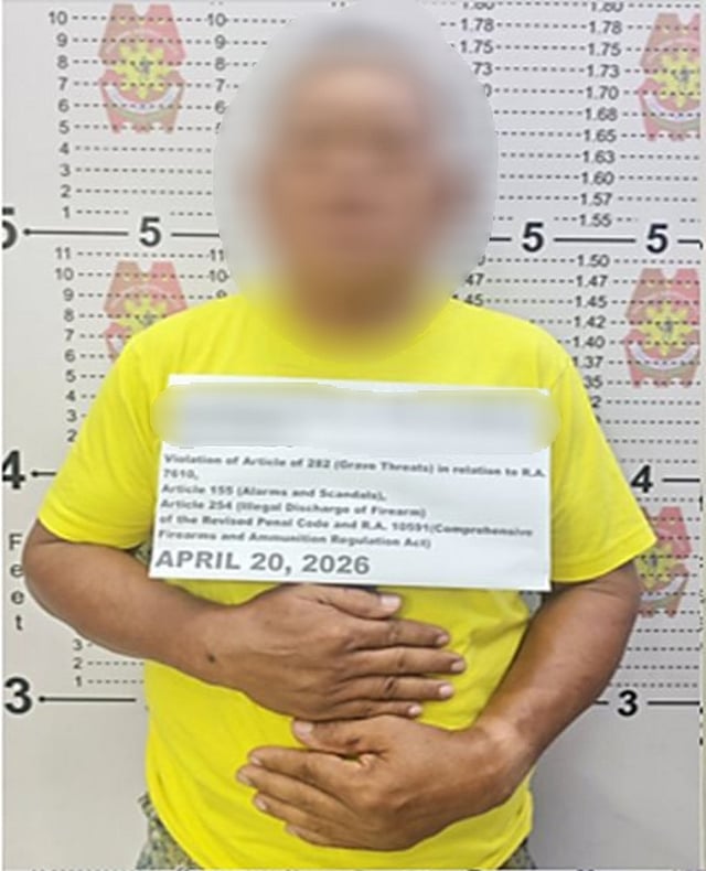 The suspect faces multiple charges, including Grave Threats, Alarm and Scandal, Illegal Discharge of Firearm, and violations of Comprehensive Firearms and Ammunition Regulation Act.