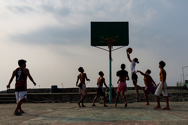 Street ballers play basketball at a makeshift court near the Navotas navigational gate in Navotas City on Monday afternoon, 20 April 2026. Players said they prefer playing in the afternoon, as the heat becomes unbearable at noon.