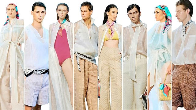 For women, vibrant swimwear peeks through sheer layers, grounded by the architectural sharpness of white, ankle-strap heels, while the designs for men move with a louche, refined ease in neutral trousers and classic brown loafers. It is a wardrobe of deliberate versatility, where tradition is not just preserved but is actively pulsating through every seam.
