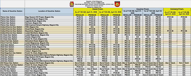 Baguio City — Fuel prices in the city declined or remained stable as of 7 a.m. on 22 April, based on the latest monitoring by the Baguio City Police Office (BCPO).