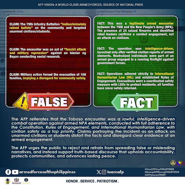 The Armed Forces of the Philippines on Friday said the Toboso encounter in Negros Occidental was a lawful, intelligence-driven operation targeting New People’s Army elements, rejecting claims that civilians were harmed.