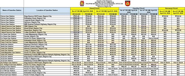 BAGUIO CITY — Data from the recent monitoring by the Baguio City Police Office (BCPO) for 24 April and 25 April 2026, show consistent pricing at several locations in the city for different fuel types.