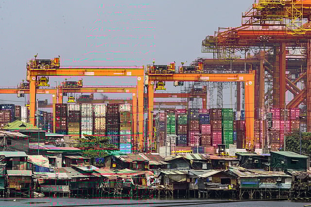 Informal settlements line the edge of the container port area in Manila, as seen from a pedestrian overpass along Mel Lopez Boulevard. A recent study by the government think tank Philippine Institute for Development Studies warns that the current oil crisis could push over 1.3 million more Filipinos into poverty as rising fuel costs lead to an immediate spike in the cost of rice, fish, meat, and vegetables.