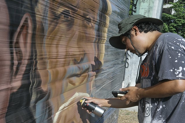 Visual artist Sim Tolentino is seen spraying paint, creating a mural, with a call to action "People united for a fossil free-future along Eliptical Road in Quezon City on Sunday, 26 April, 2026.| Aram Lascano