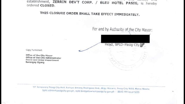 The Pasig City local government has issued a closure order against Zerrin Development Corporation, which operates Bleu Hotel, following a National Bureau of Investigation (NBI) operation that led to the filing of human trafficking charges involving individuals linked to the family of former lawmaker Mike Defensor.